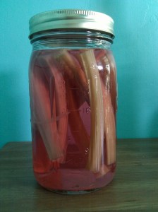 I started with one large stalk of rhubarb, well cleaned, and a fifth of Stoli. I put this all in a Ball jar and let it sit.