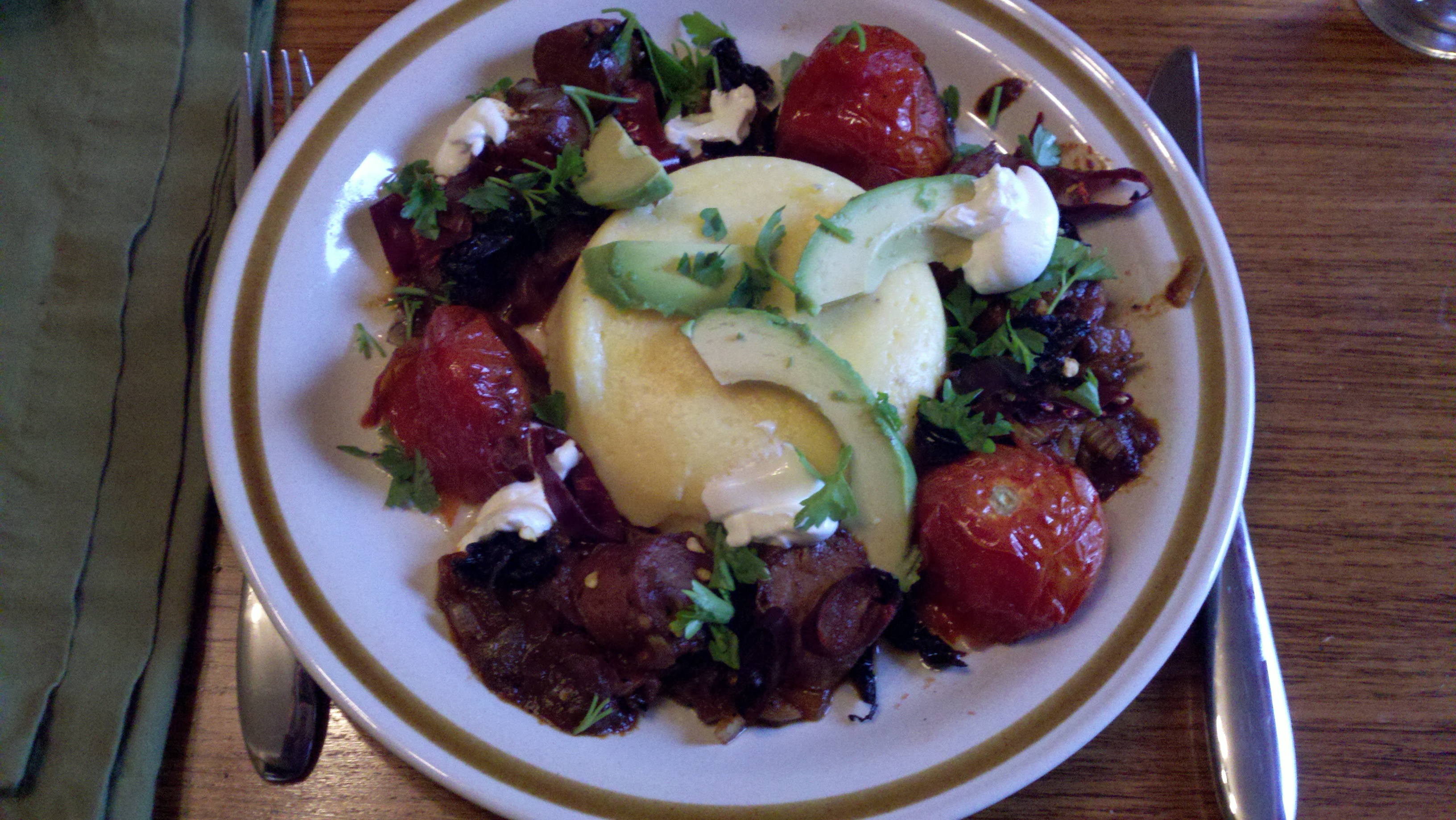 Flipping through Deborah Madison’s Vegetarian Suppers cookbook, I was inspired by the prep photo for one of her meals. It showed roasted garlic, peppers and tomatoes. In her recipe those are pureed and poured over pasta, but I wanted to eat them whole (or nearly). And it seemed polenta would be the perfect accompaniment.